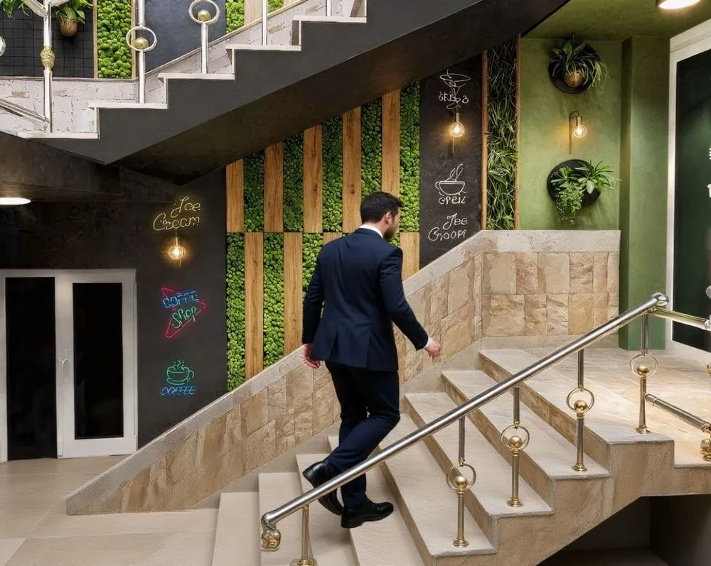 a man is walking up the stairs in a suit