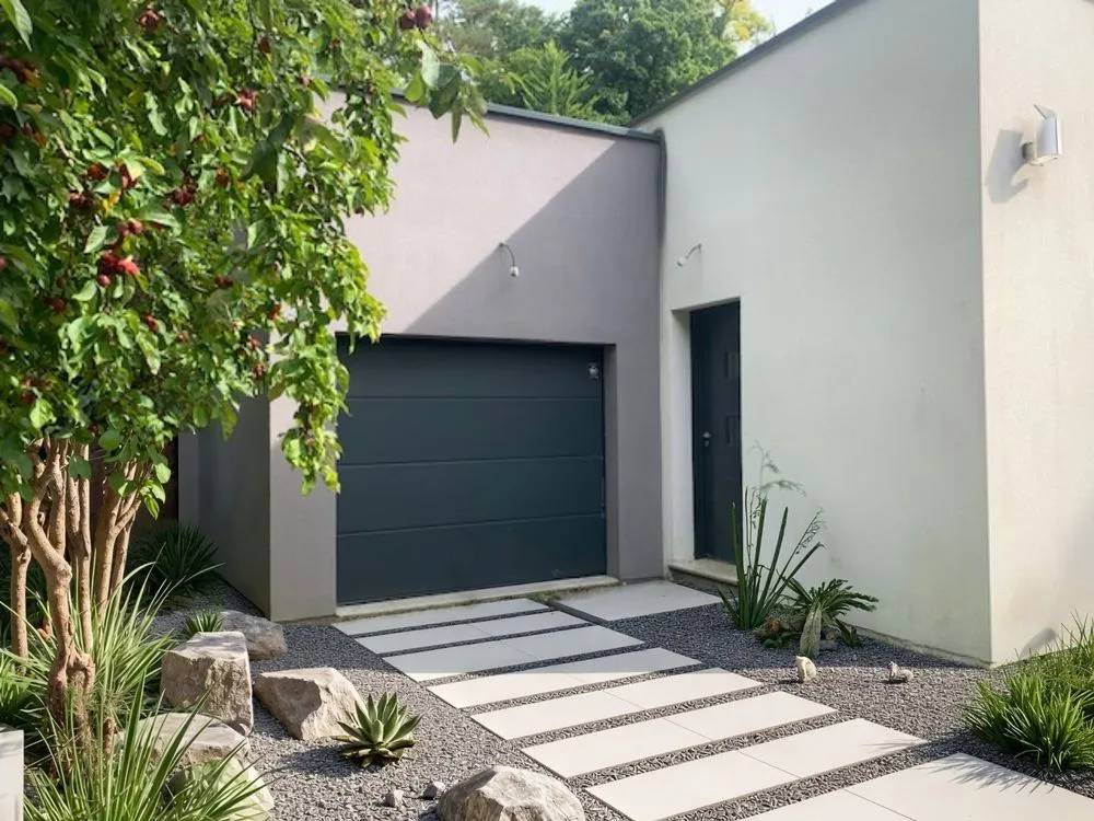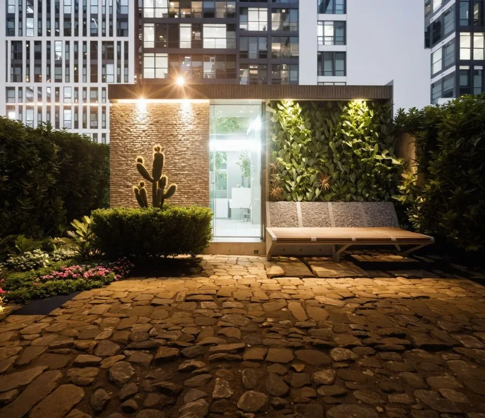 a modern home with cactus themed landscaping at night