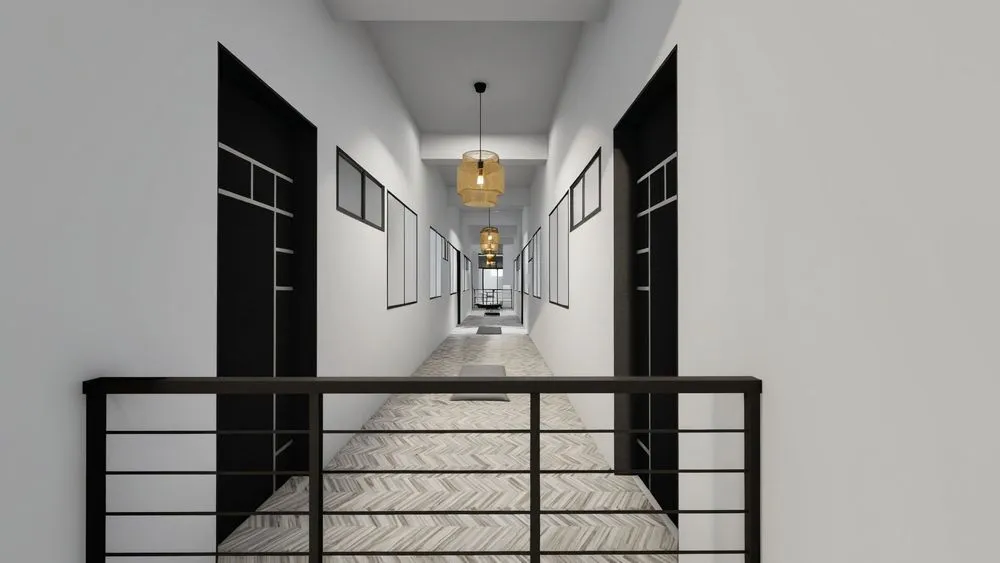 a long white hallway with black doors and a light fixture