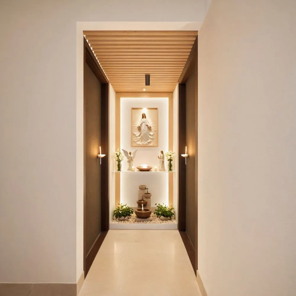 an open hallway with two shelves, candles and plants