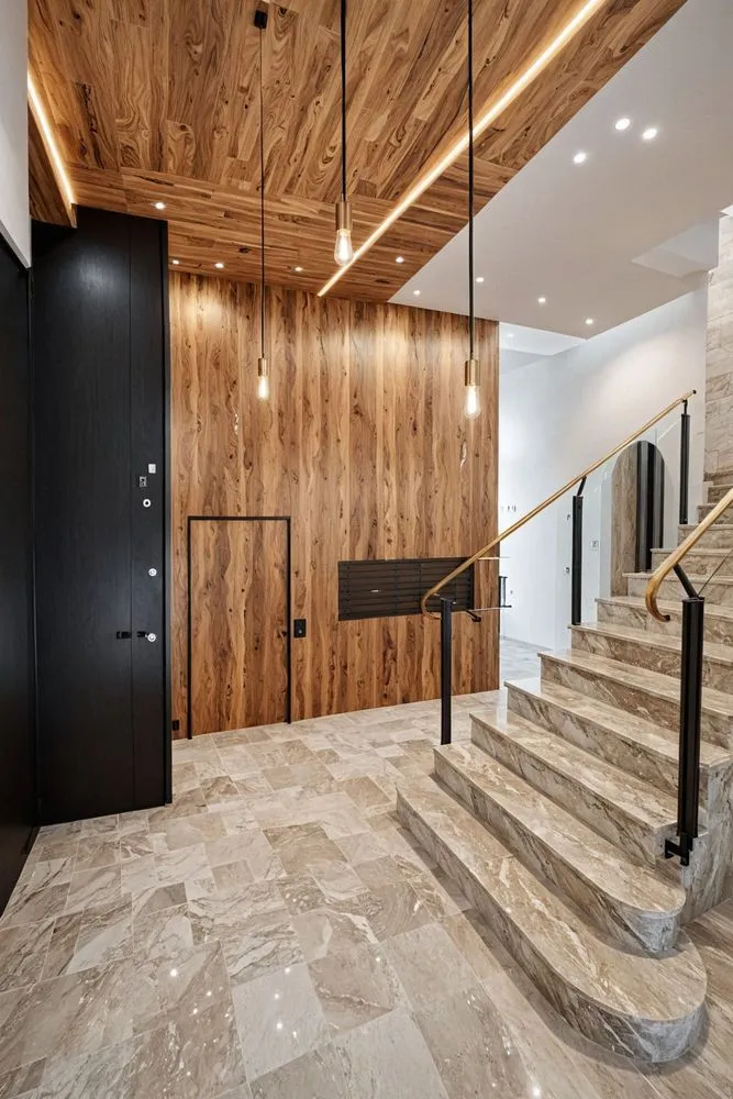 a large wooden stairwell next to two black doors