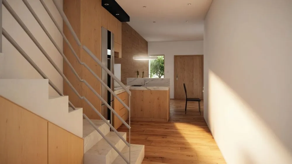 a stairway leads up to a large modern home