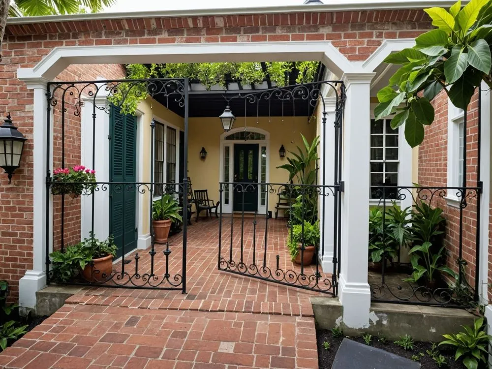 an open gate into a brick home with greenery on either side