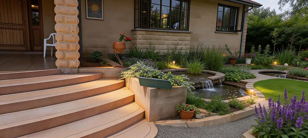 steps lead down to an attractive patio with a water feature