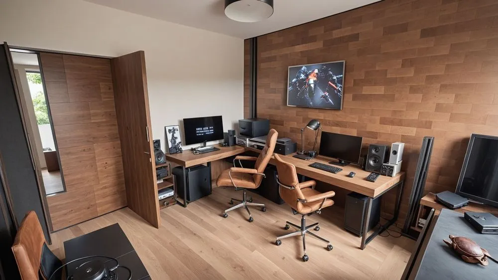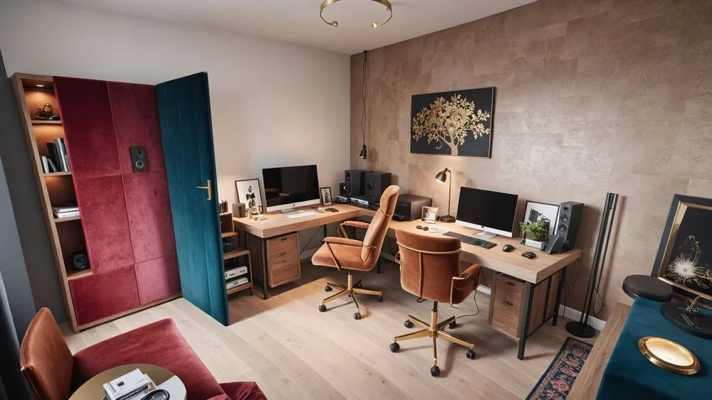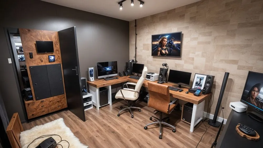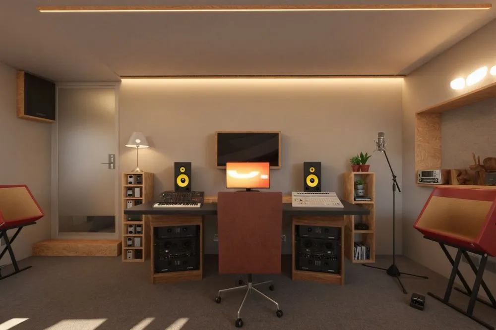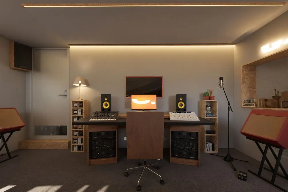 this is a recording studio with a desk and various audio equipment