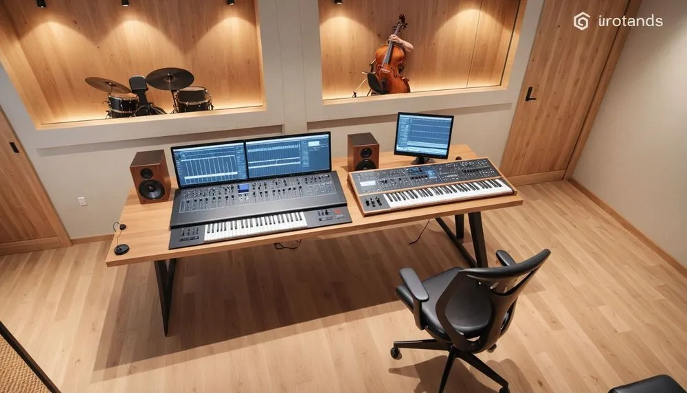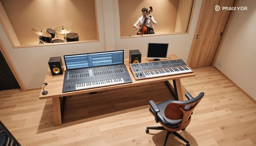the music studio has a table with instruments and equipment