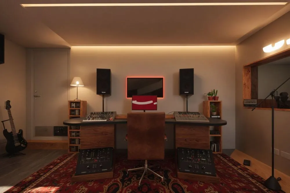 a recording studio with mixing equipment and electronic equipment