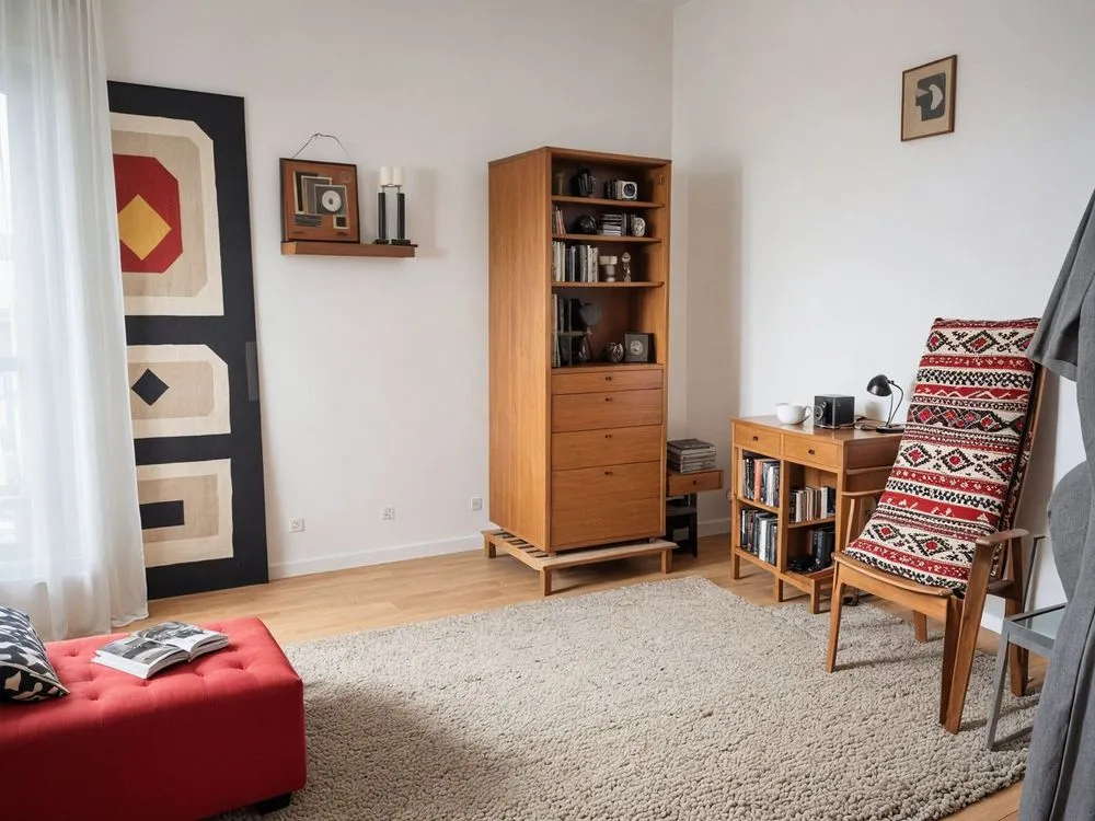 a living area with a red chair and wooden bookshelf