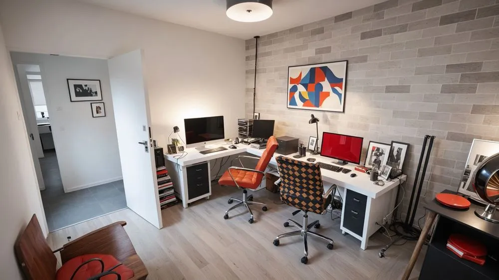 a room with a desk, computer, and two chairs