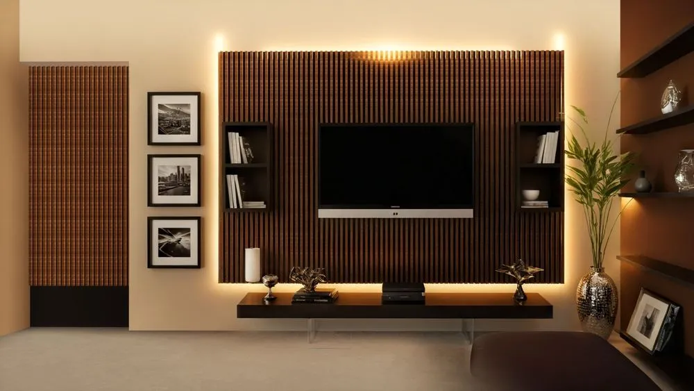 this living room has brown walls, a beige carpet and a wooden entertainment center