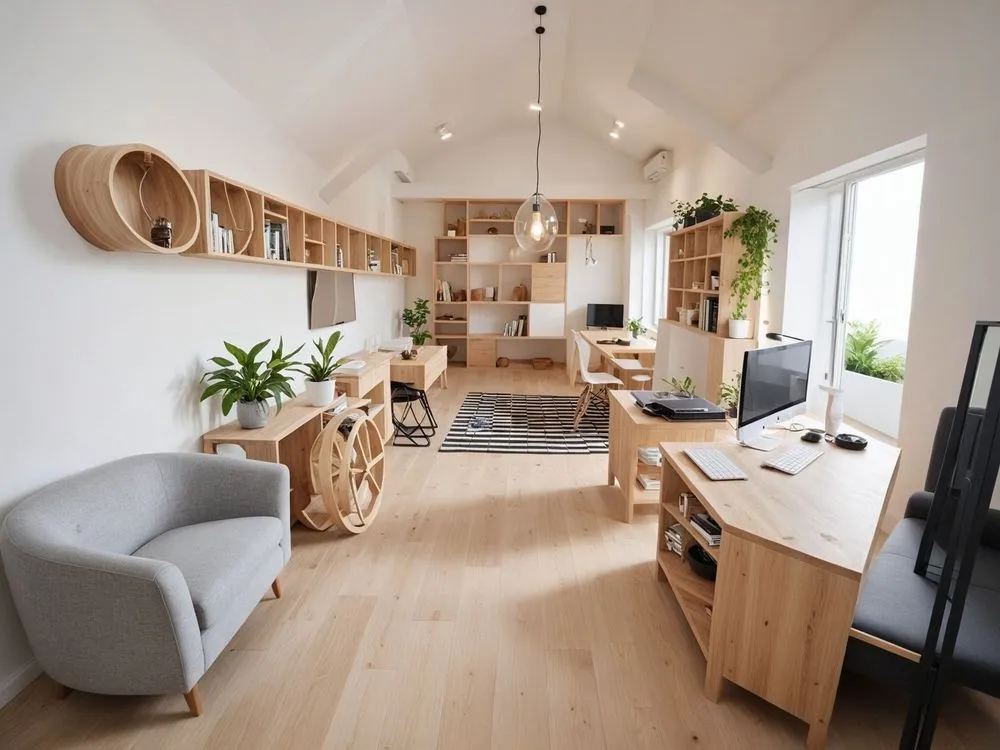 a small living room with shelves and seating