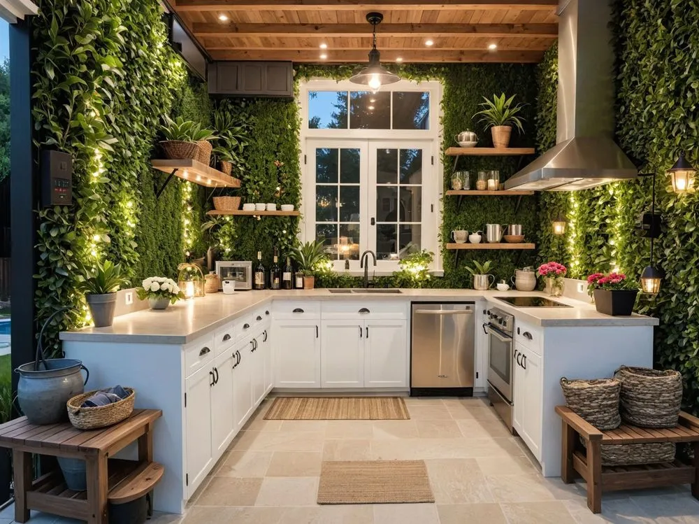 an outdoor kitchen that looks great with a lot of greenery on the wall