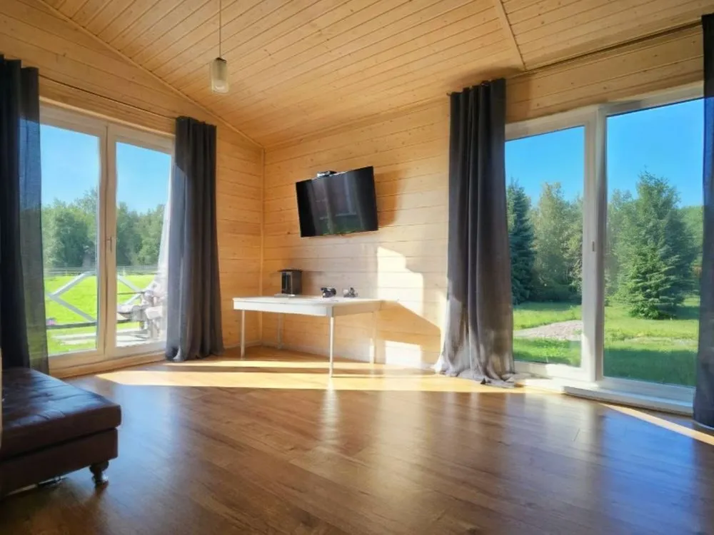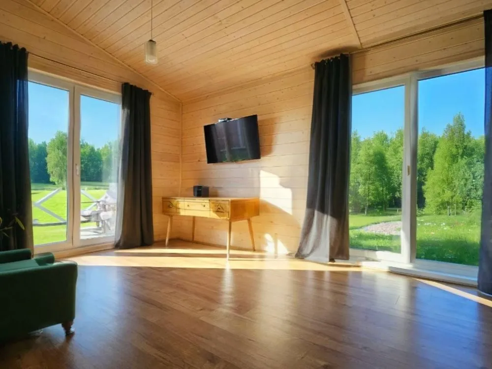 a living room area with couches, a table, a tv and a large screen television on the wall