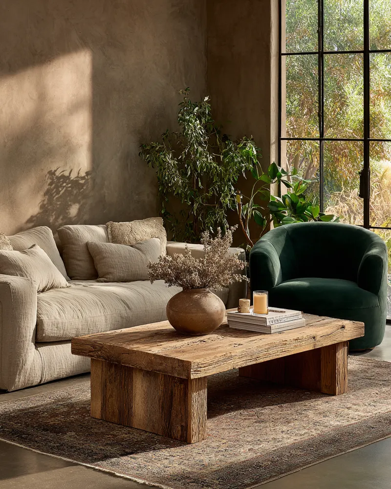 Natural Wood Accents for an Organic Desert Living Room 🪵