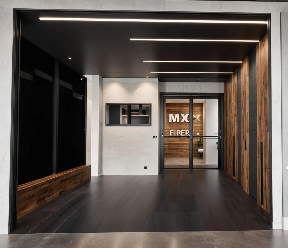 this picture depicts the entrance to a meeting room with wood paneling, a table and chairs and a man in a beige shirt