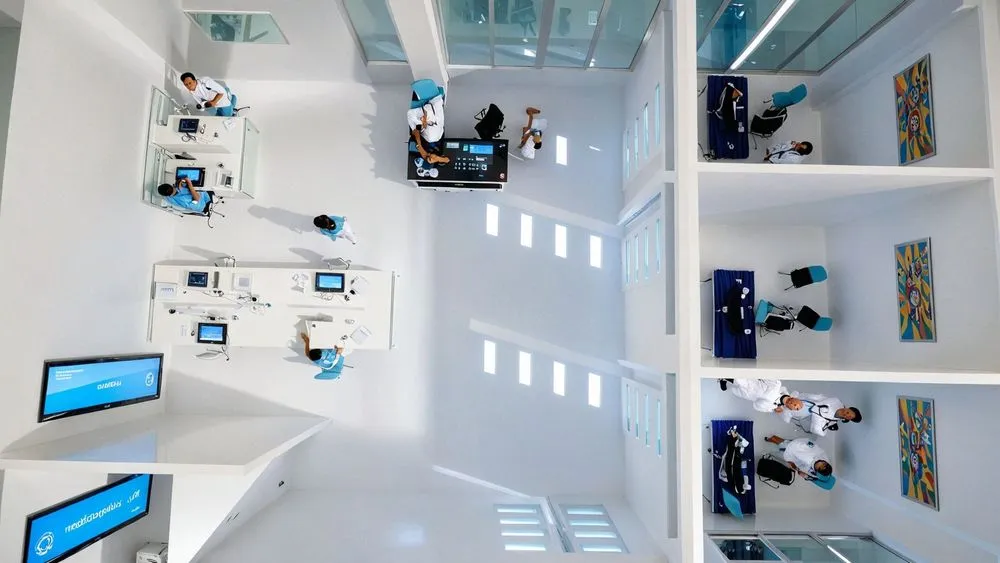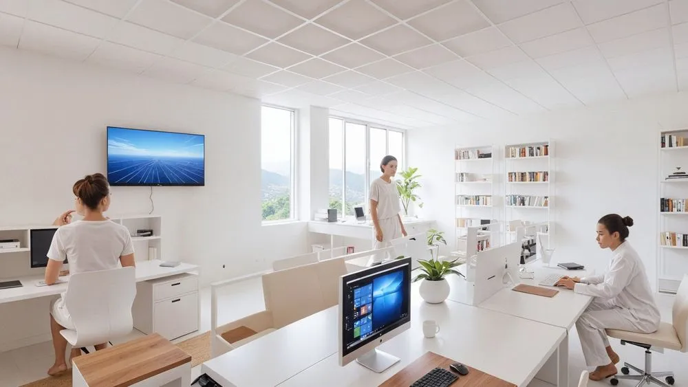 a computer lab is equipped with computers, plants and wooden plank ceilings