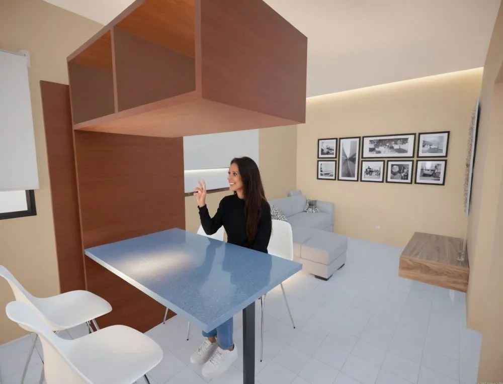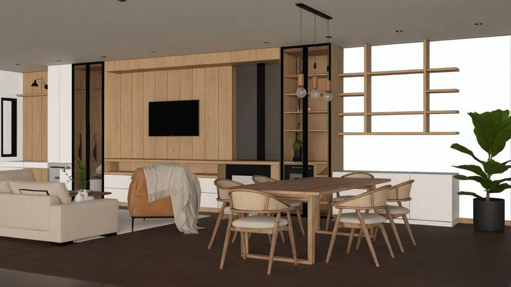 this is a 3d rendering of a dining room and living room with natural wood furniture