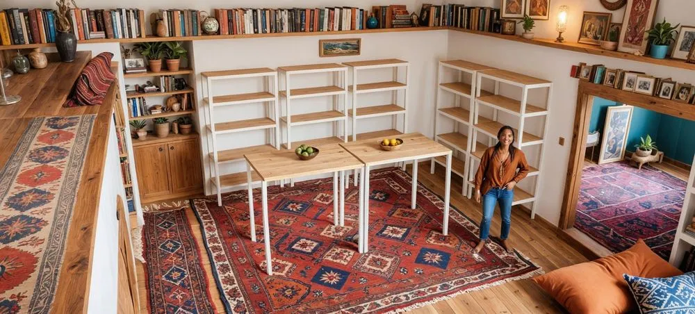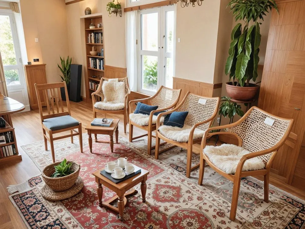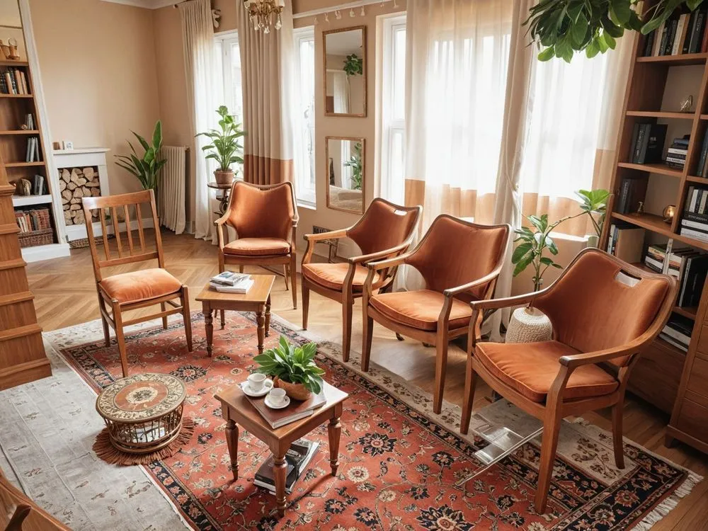 a living room with furniture on a round rug