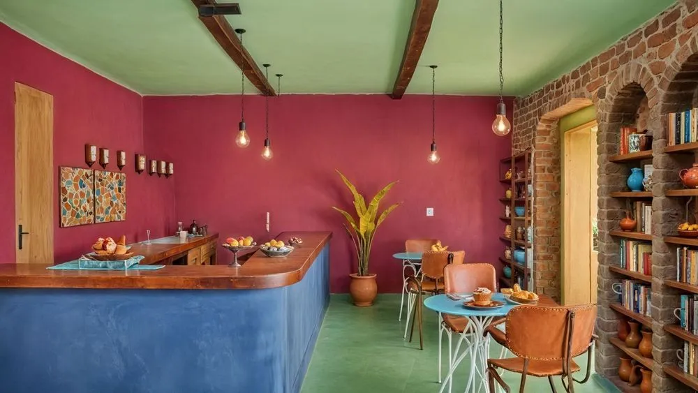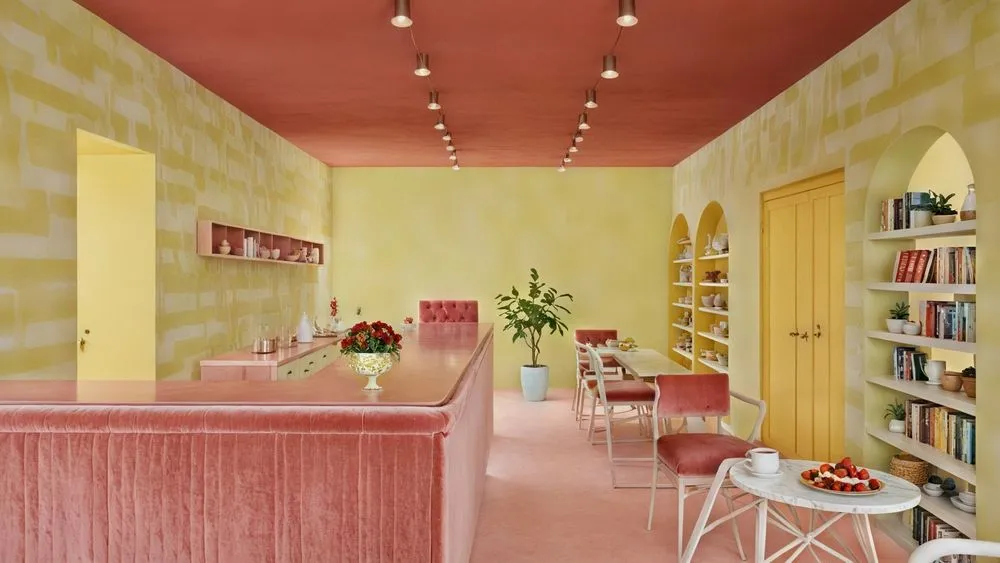 the dining area of an office with pink walls