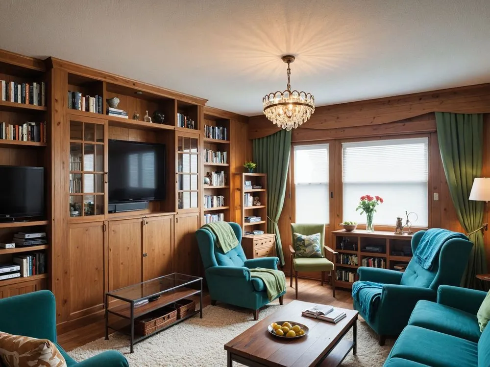 a clean living room is decorated in teal