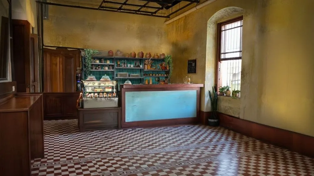 the large room has checkered flooring and a colorful counter