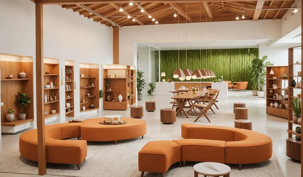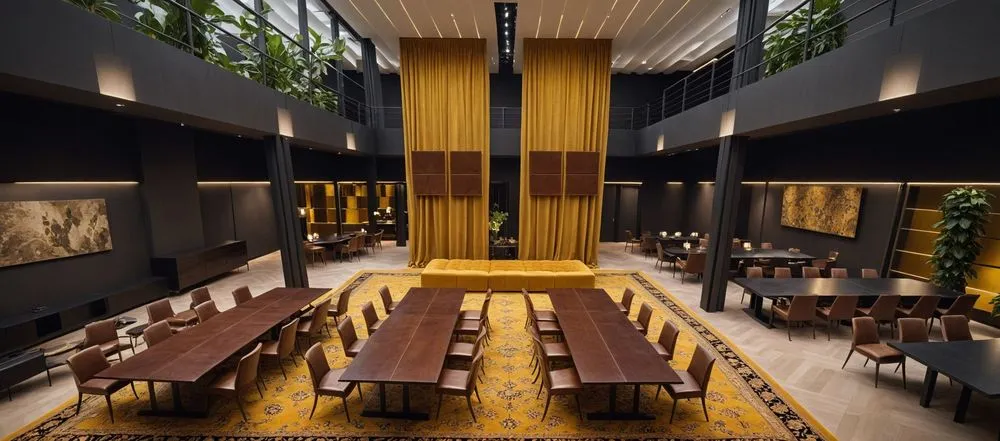 a large room with a yellow seating area