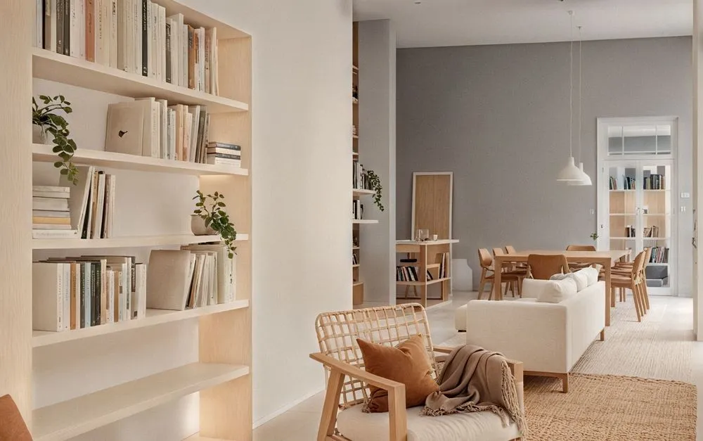 an apartment living room with bookshelves and a chair