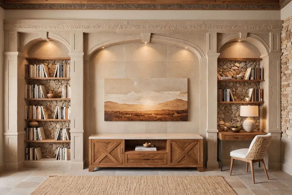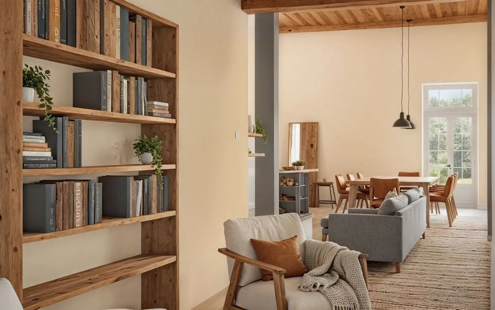 a room with shelves and a chair that is beige