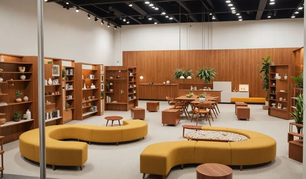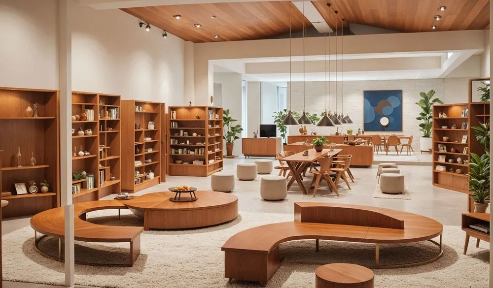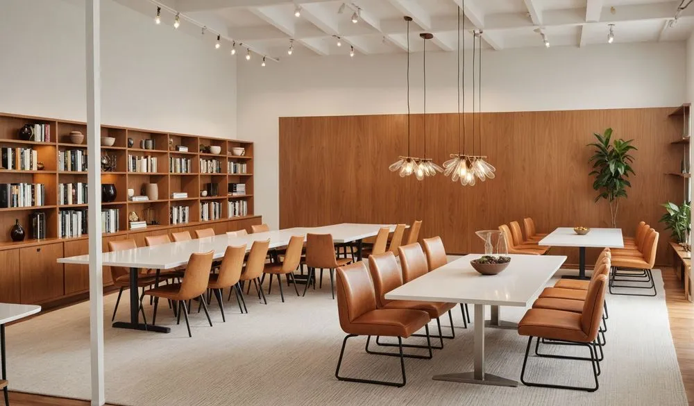 a large room with tables and chairs, bookshelves and a vase