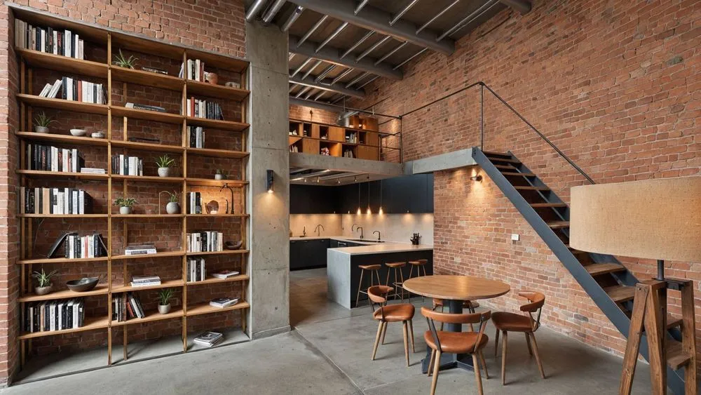 a brick wall with shelves of books and stools in the corner
