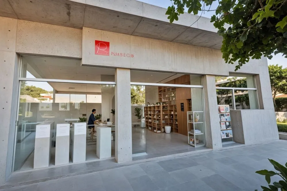 a glass table sits in front of bookshelves