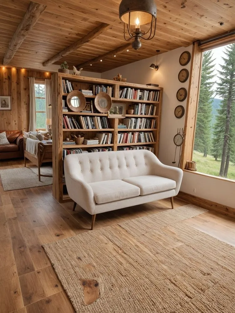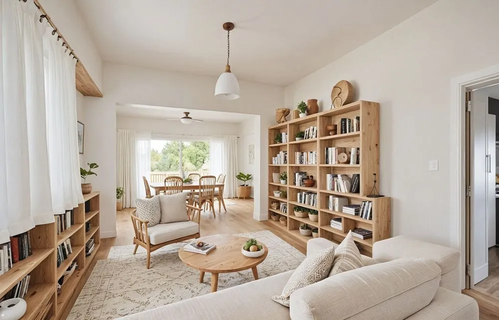 living room with large open bookcase and white couch