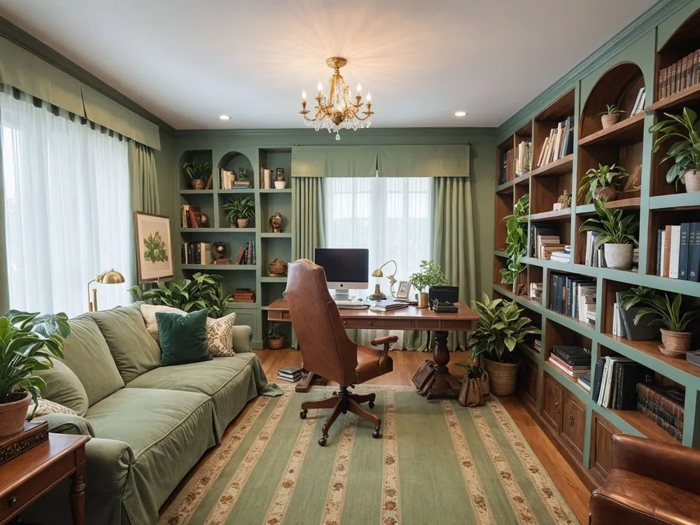 a living room with a green couch and chairs