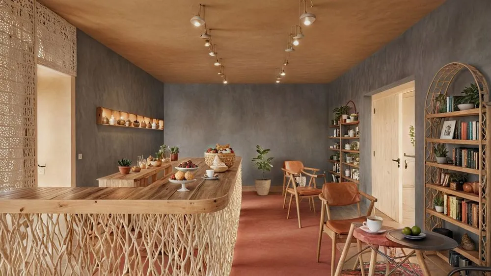 a table with chairs, potted plants and bookshelf