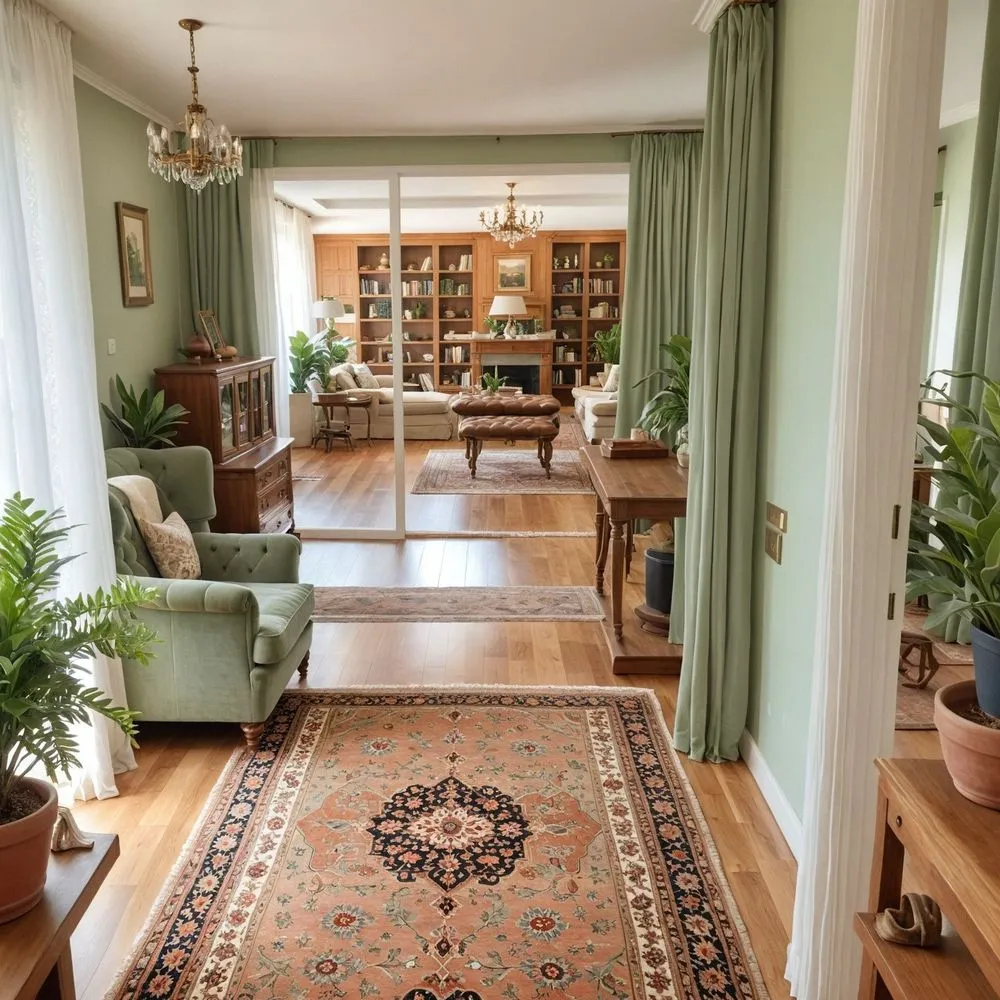 the living room is decorated with green furniture and a beautiful rug