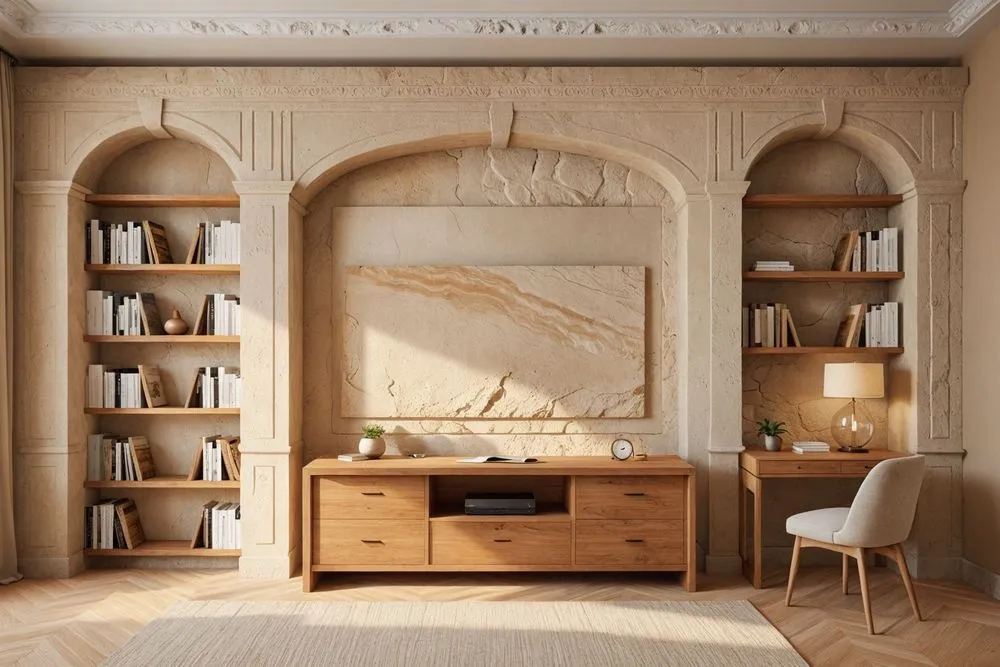 there is a large marble book shelf and bookcase in the living room