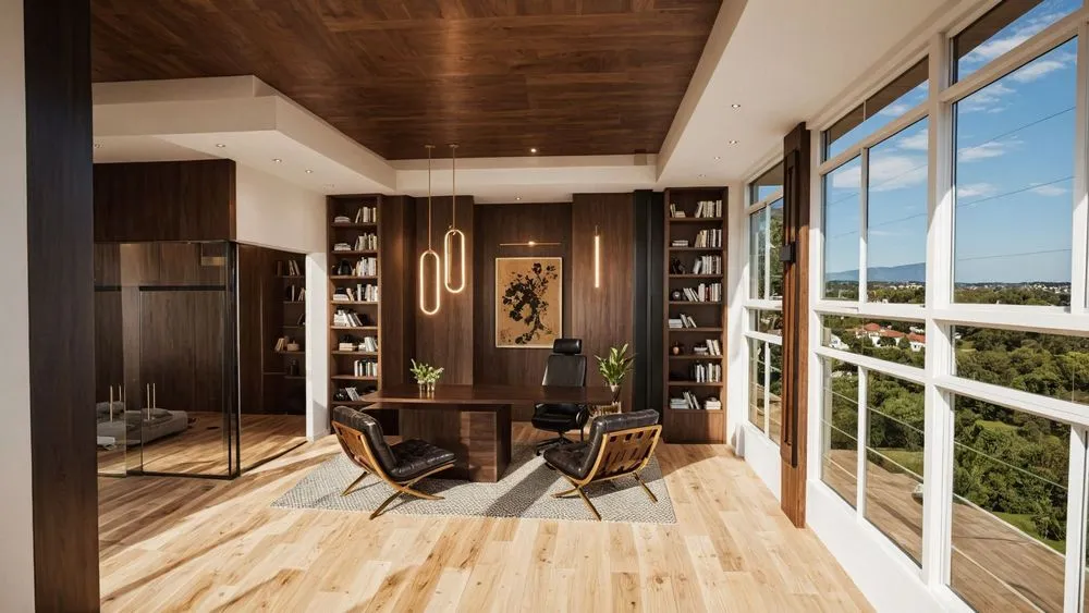a large living room with wood floors and a high ceiling