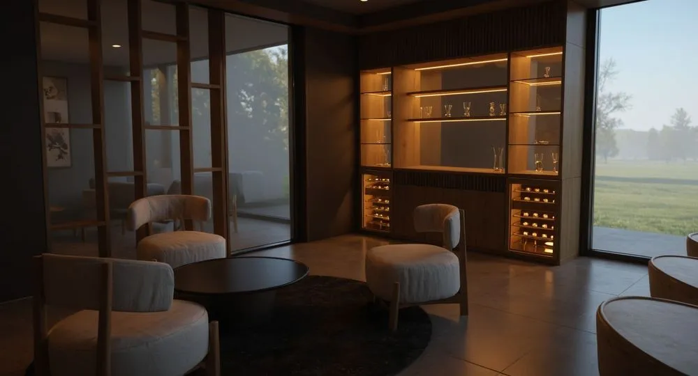 a glass table sits in front of bookshelves