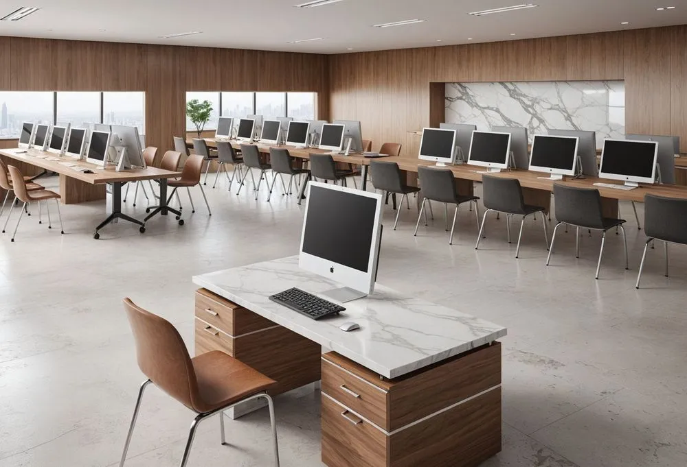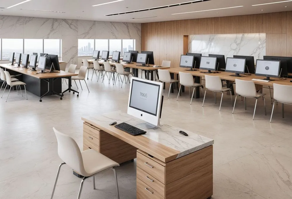 a computer lab with long tables with chairs
