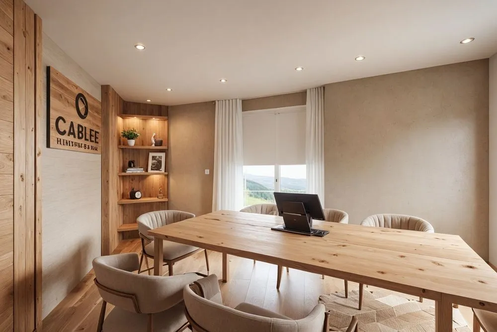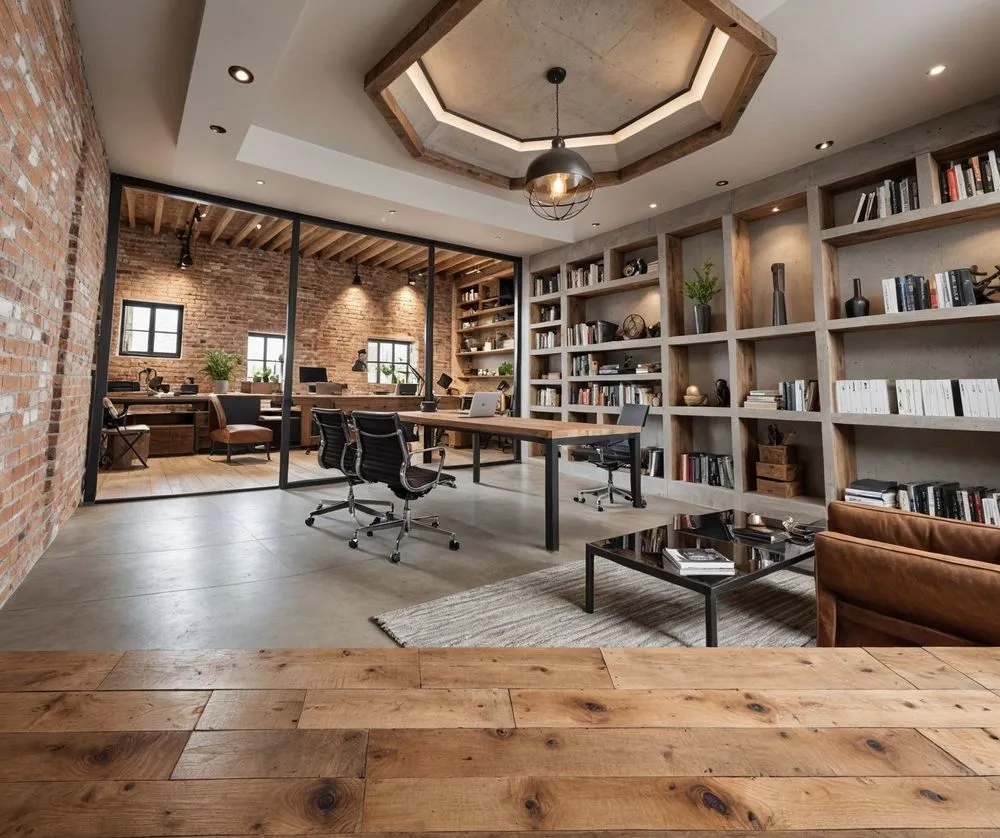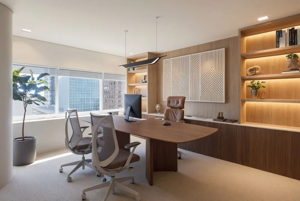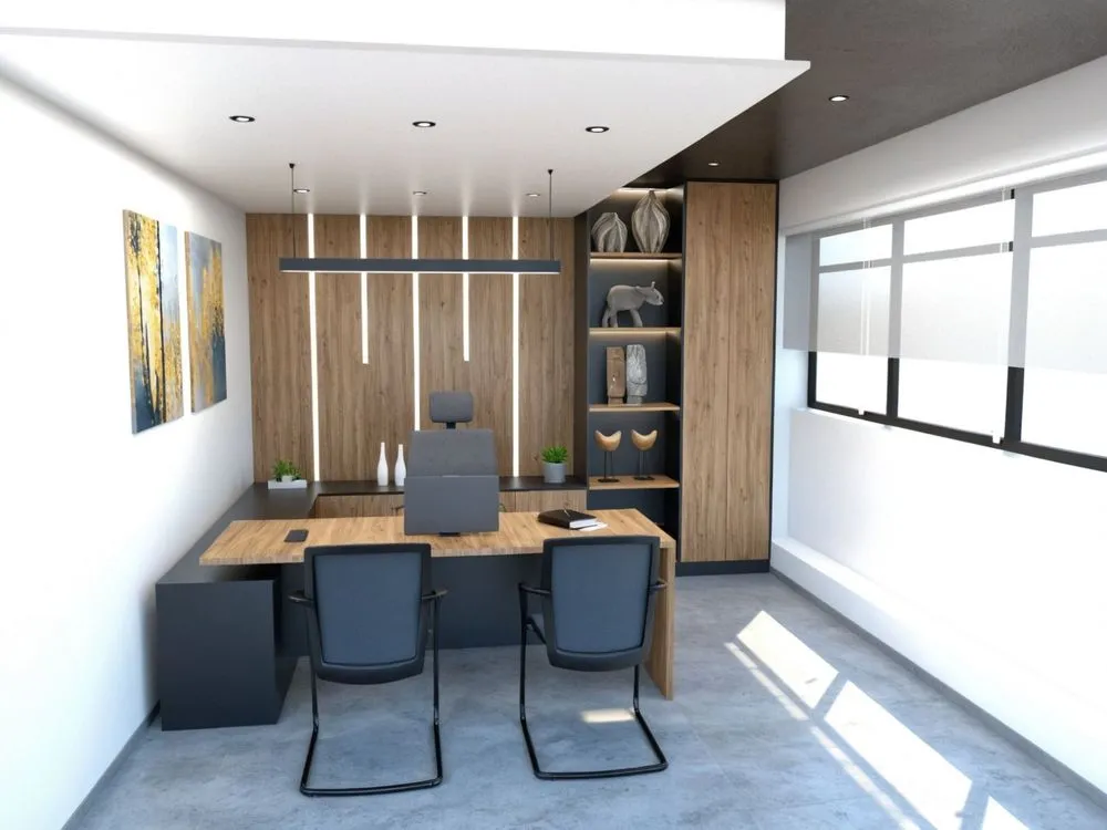 a modern office space with wooden furniture and shelving