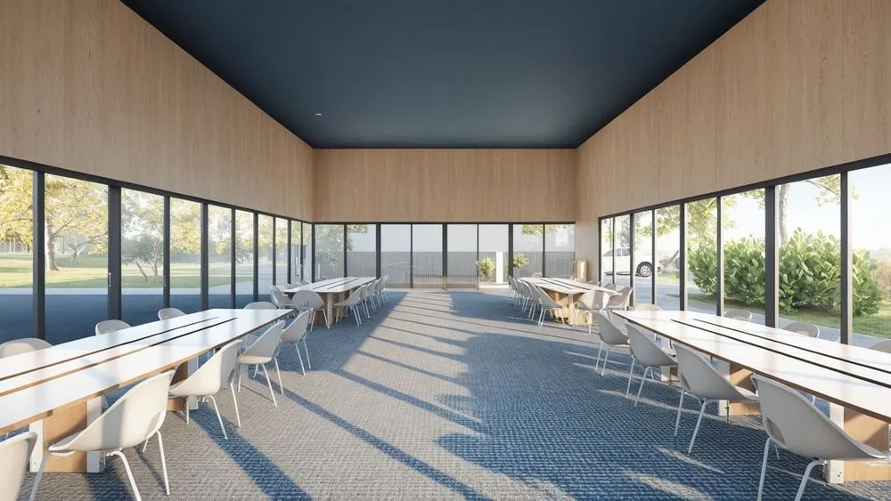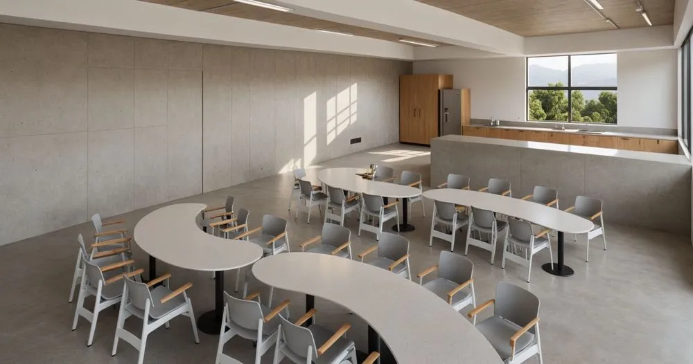 a meeting room with a lot of chairs and tables