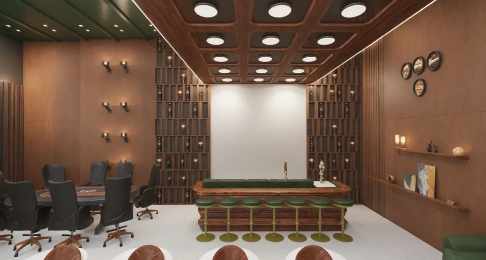 an empty room with tables and stools