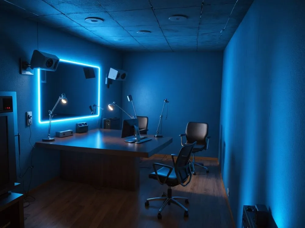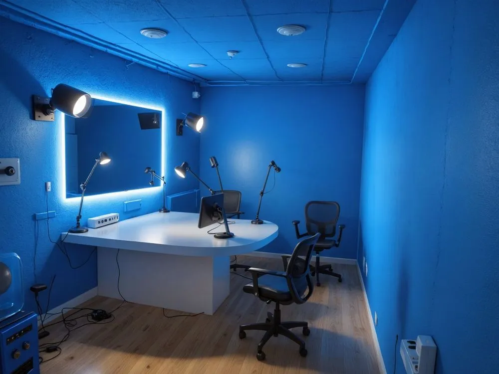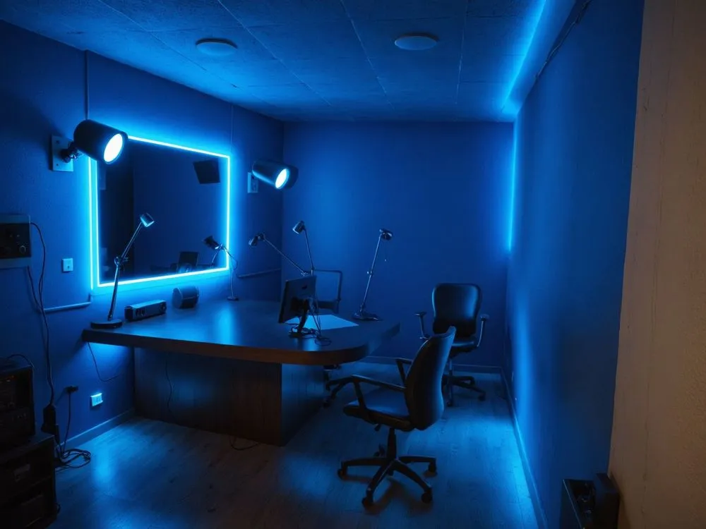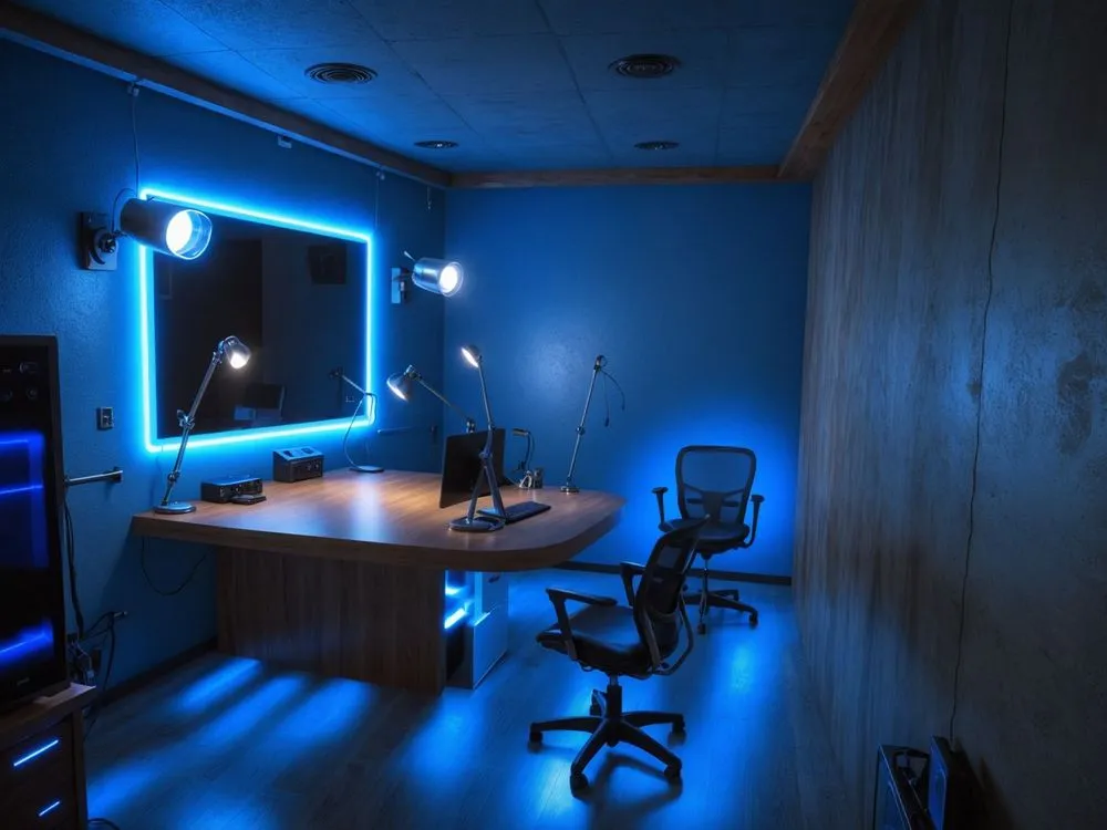 an office with blue lights shining on the walls
