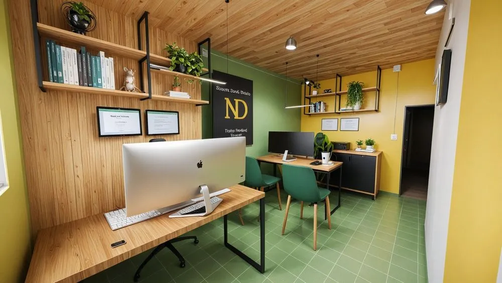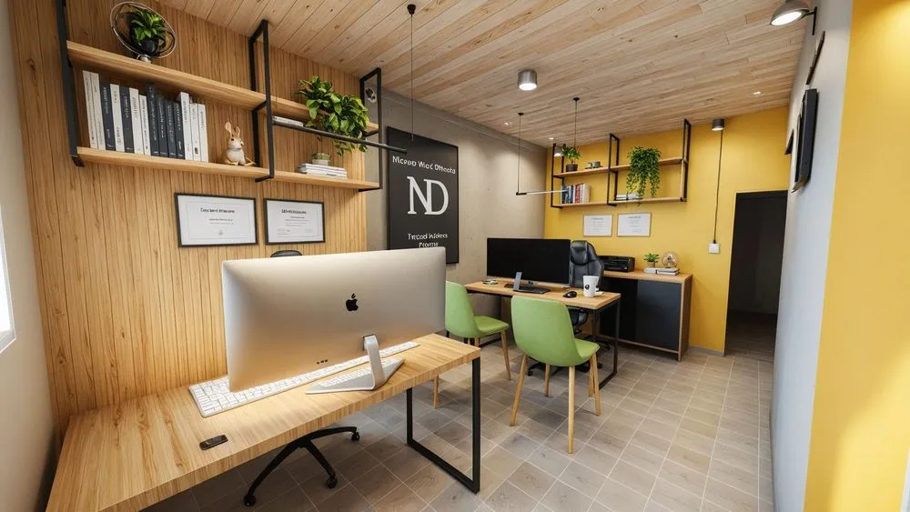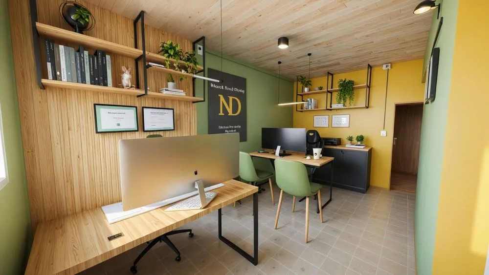 a home office with the theme's logo