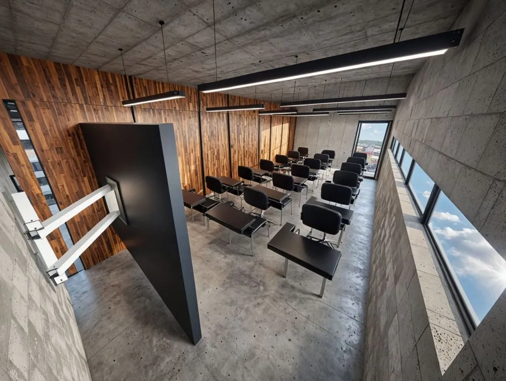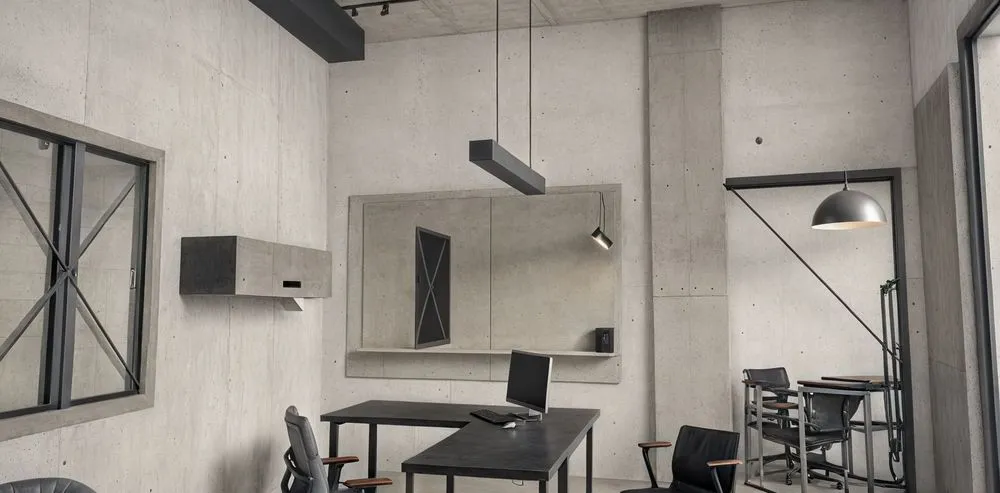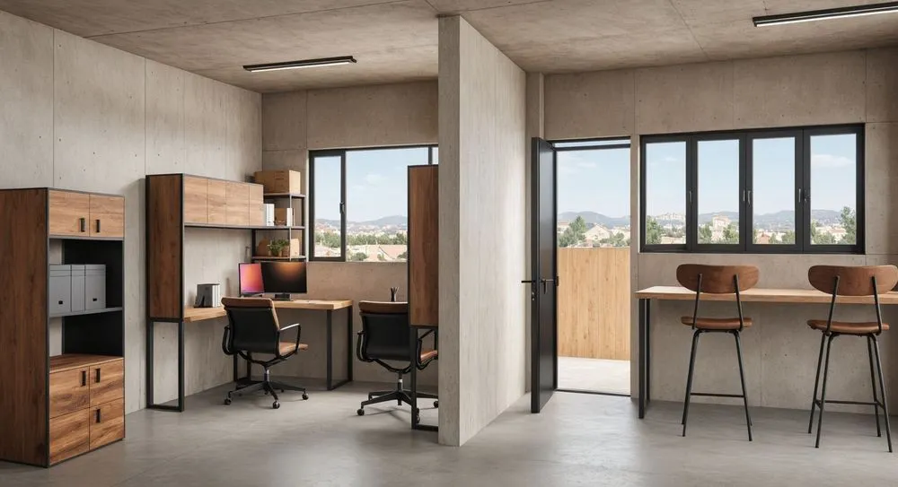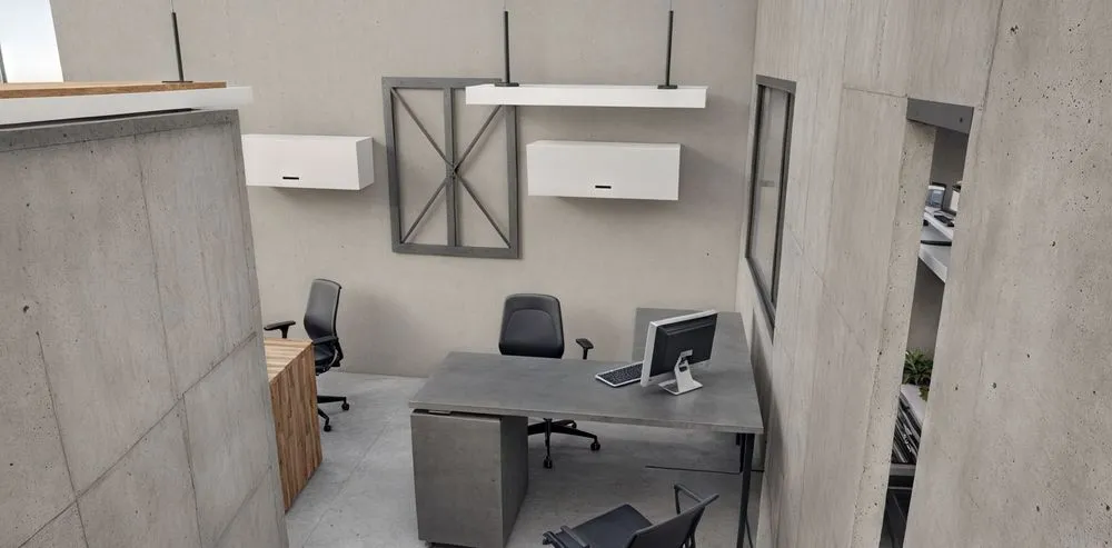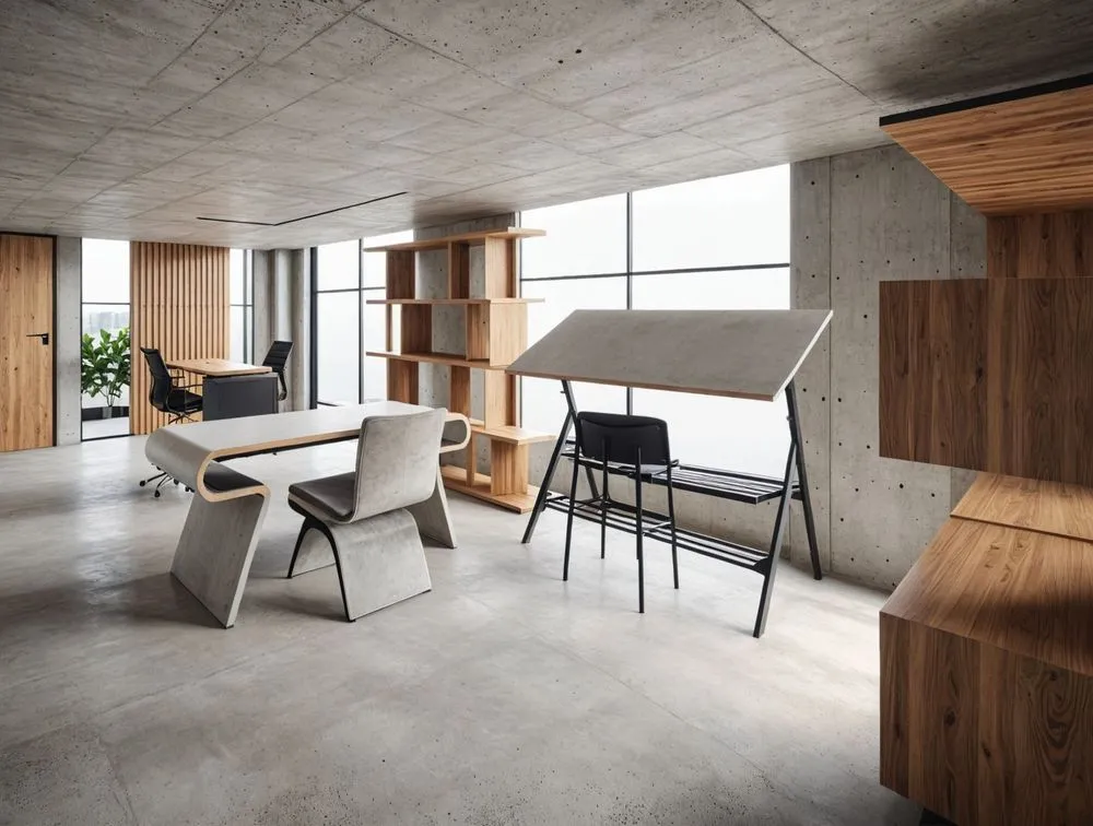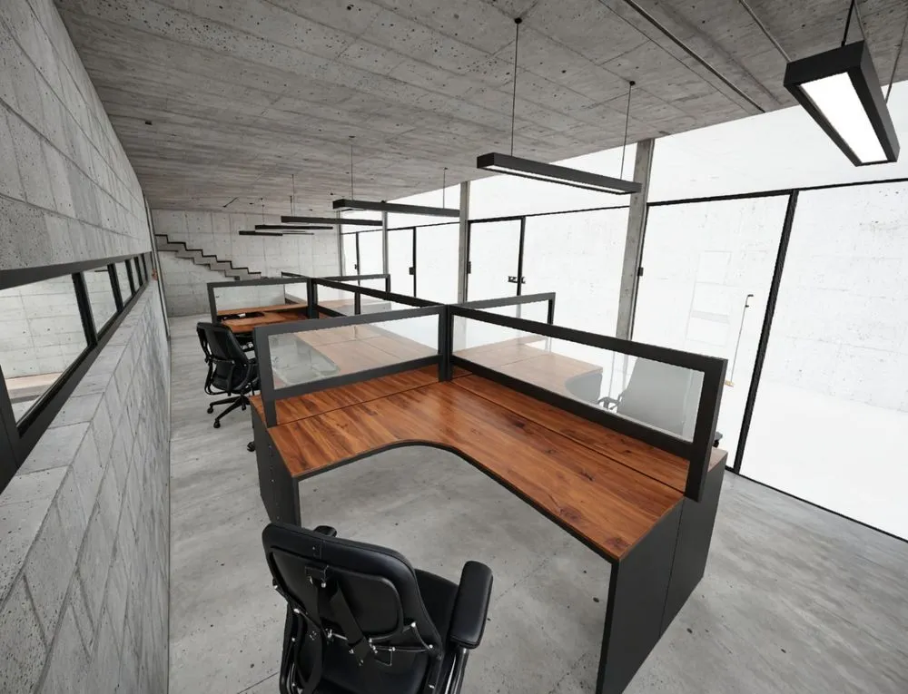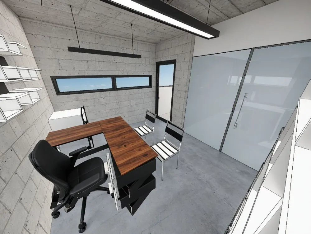 an office in the middle of cement with no one present