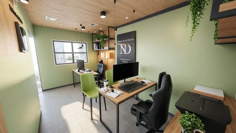 a desk that is in the middle of an office