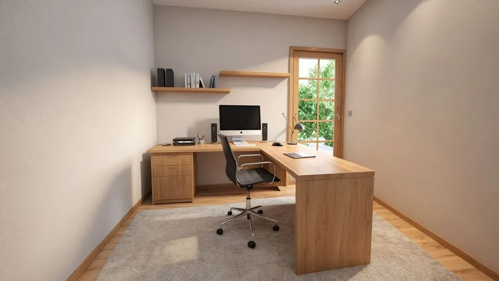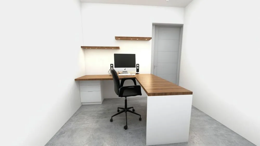 an office desk in the corner of a room