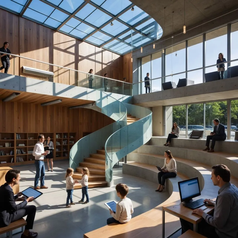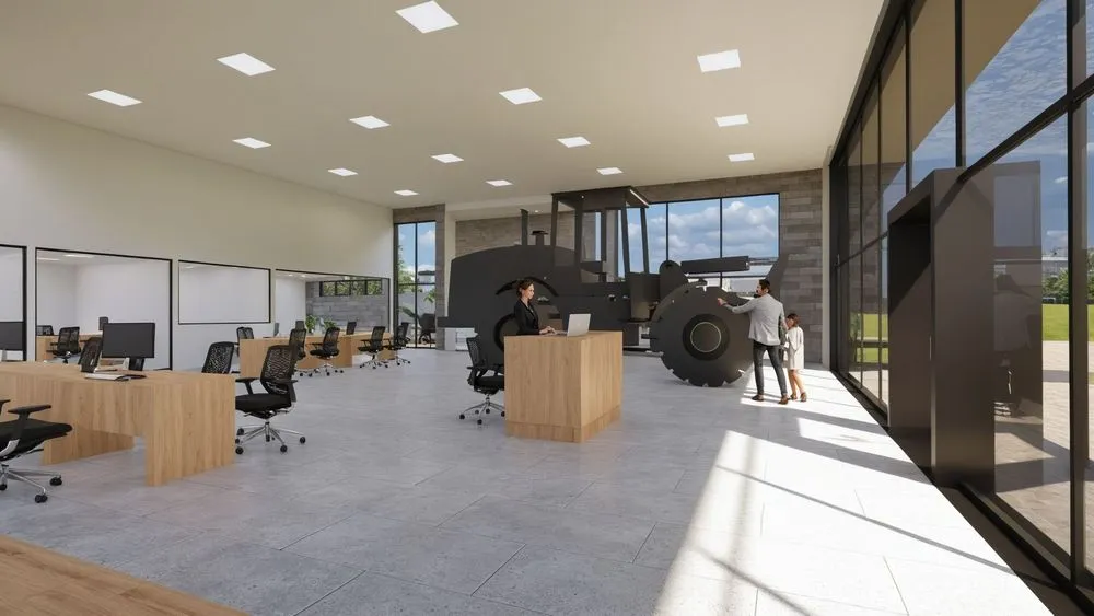 a rendering of a woman in an office setting with a meeting table, chairs, and people seated at tables