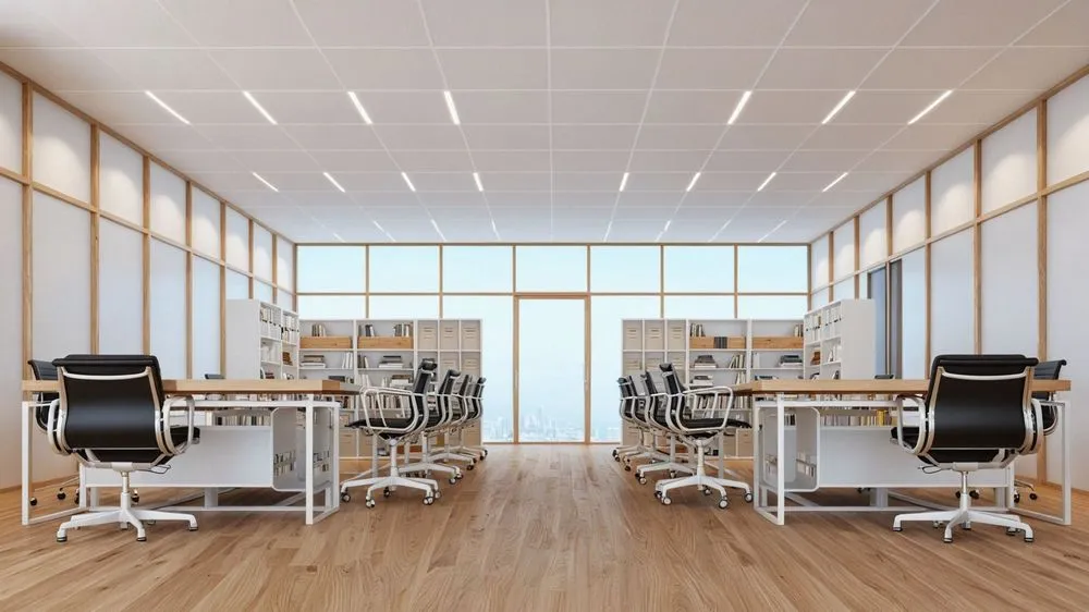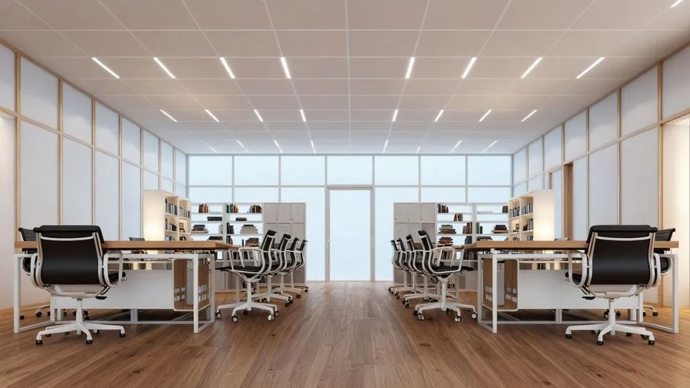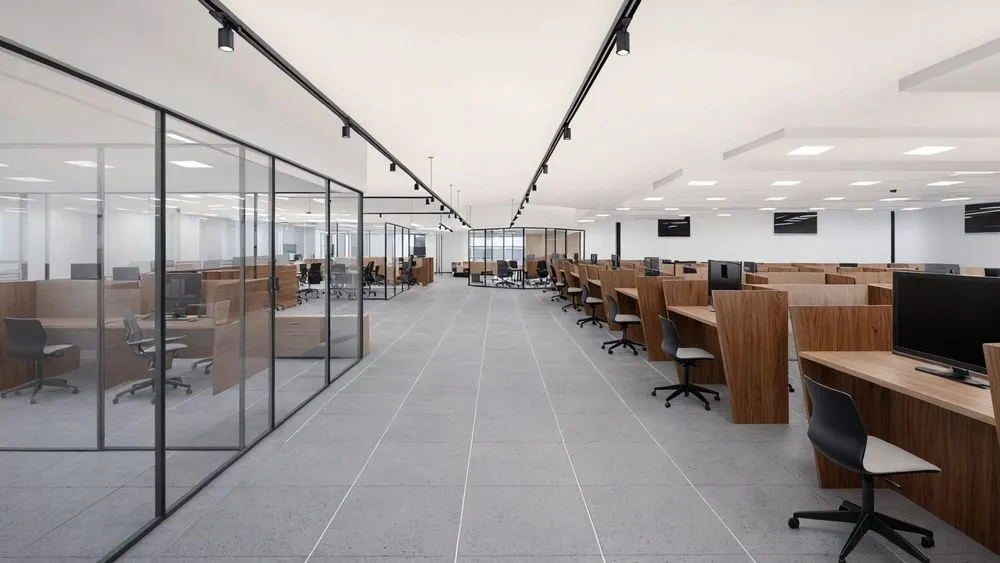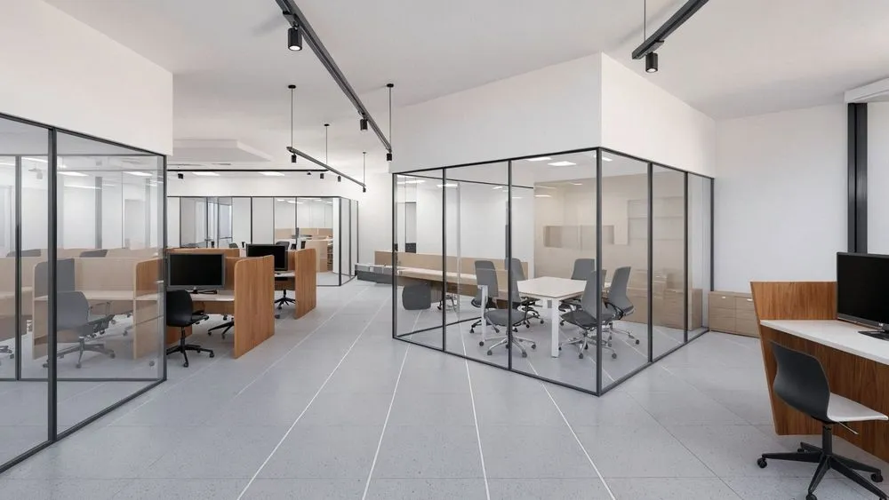 an empty open concept office room with glass walls