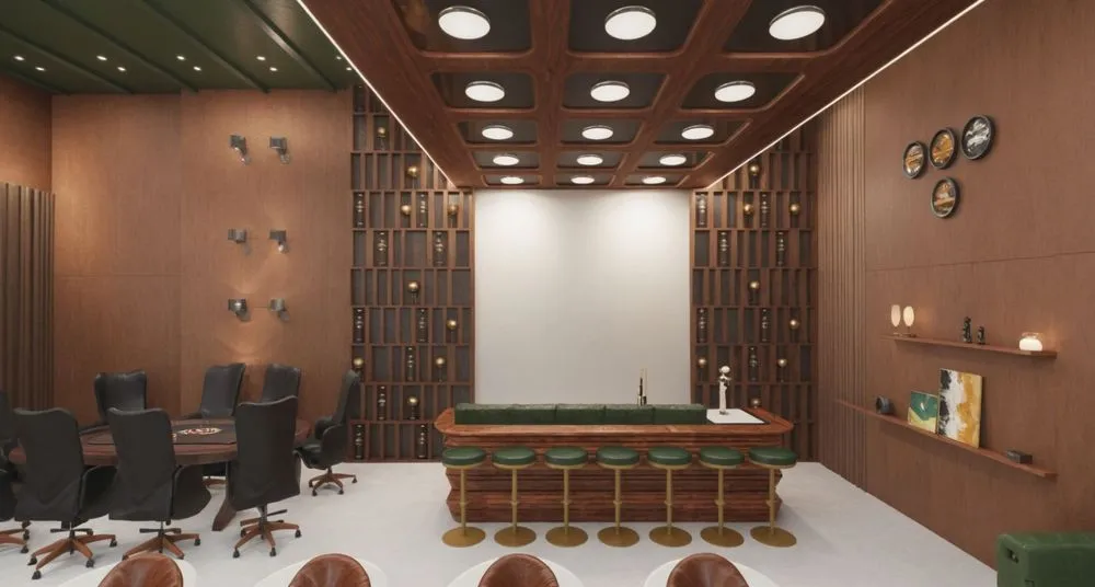 an empty office conference room with brown leather chairs
